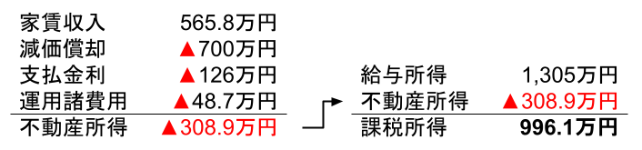 建物価格5600万円を8年で償却する計画で不動産所得を308.9万円の赤字にし、給与所得と損益通算しました。