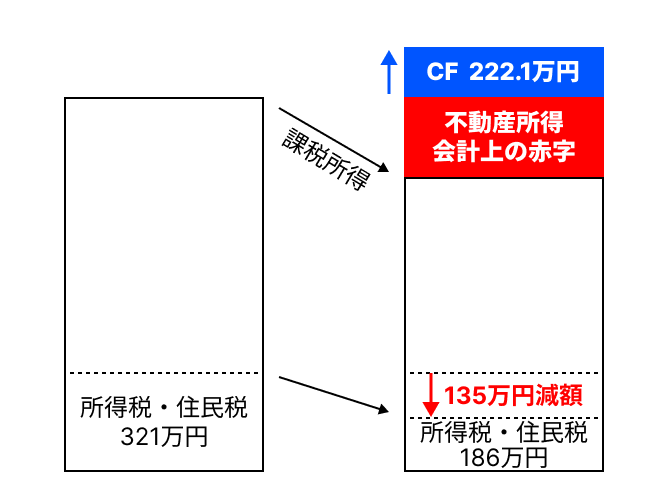 この不動産経営戦略によって、年間222.1万円のキャッシュフローを生み出しながら、一方で年間約135万円の所得税・住民税の軽減に成功しました。