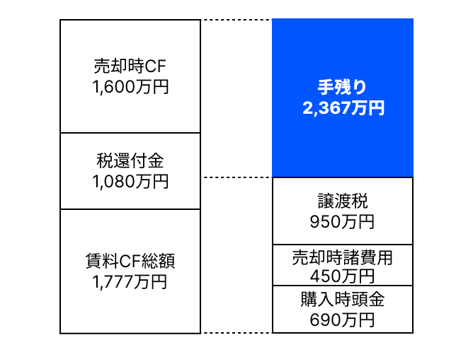 賃料キャッシュフローの累計総額、税還付額、売却時キャッシュフローから、譲渡税、売却時諸費用、購入時頭金を差し引きます。