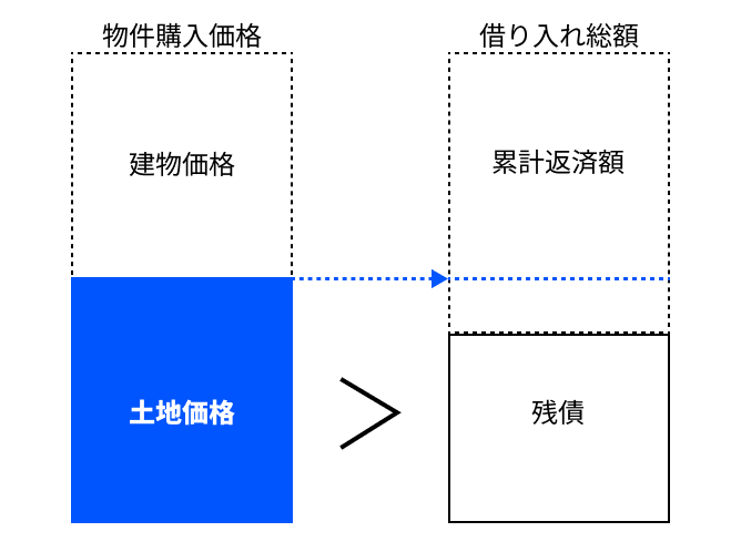 たとえば、価格8,000万円の物件(土地5,000万円、建物3,000万円)を全額借り入れで購入し、毎月の家賃収入から累計で3,000万円を返済したとします。このとき、借入金の残債5,000万円が土地購入価格5,000万円と等しくなります。その後、さらに返済が進み、例えば残債が4,000万円になった時点で、最低でも土地価格5,000万円で売却できれば、ローン完済に加え1,000万円の売却益が発生する計算になります。